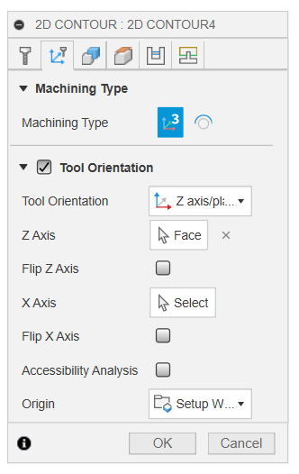 The actual “go here to make this cut” for indexing is setup per-operation. Here’s a contour cut on a part at 90 degrees– All I did was pick the new Z-axis (in this case another face that is perpendicular to the cut)/plane and Fusion (I use the Tormach post) outputs the G0 A90 before the cut begins.