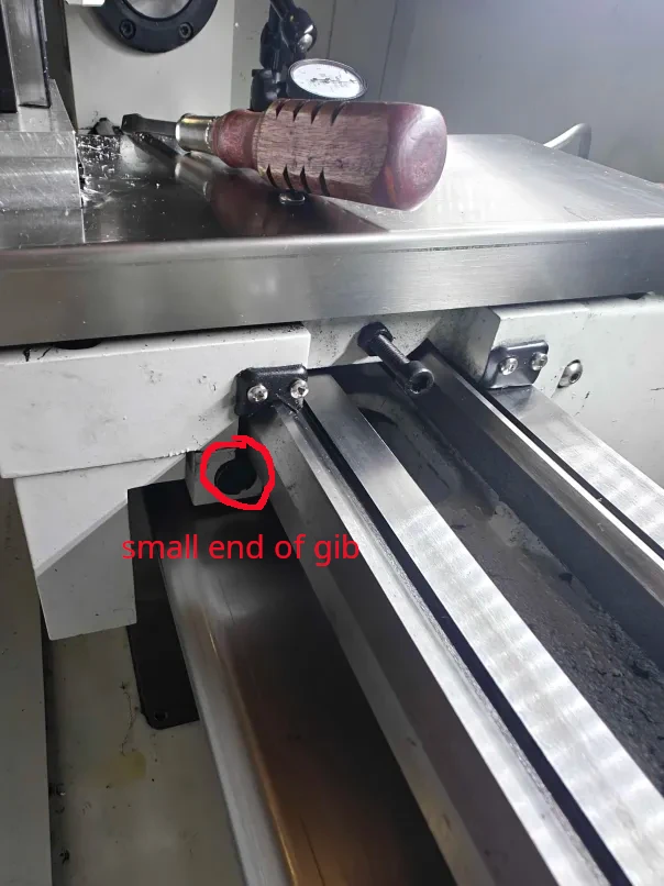 - Remove both gibs and ensure there are no burrs/nicks. This shouldn’t be necessary unless the machine is heavily worn. For reference my machine is from 09/2023 and I could still see all the scraping marks on the gib with only one or two small wear patches. The side with the notch for the retaining screw is the large side of the gib so it will slides out from that side. Clean as best you can and set aside.