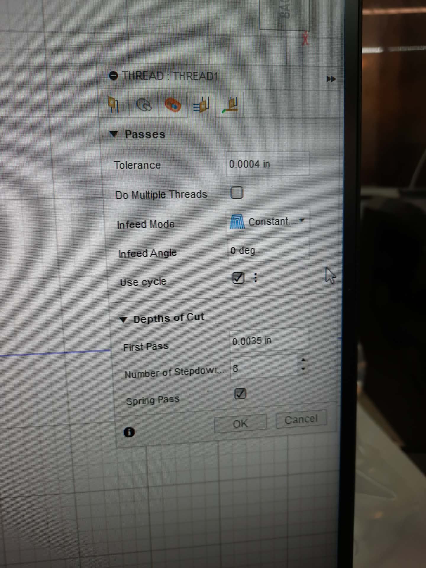 I use Fusion to program the parts I run on my 8L. When I set a threading cycle, the tool approaches to the correct pre-set locations ready to run the cycle and then retracts in X almost a half of an inch (not exactly a half, but almost). Then it runs the threading cycle beautifully (approx. 0.500” above the part). I can’t find anything in Fusion that I’m aware of that I’m doing wrong, but I’m leaning towards that being the problem. Either there’s a box I’m checking/not checking, or there’s something weird in the post for the 8L. Has anybody els had this, or a similar problem? Once I remove the line from the program that has that errant X move, the threading goes along perfectly. Weird, and probably my fault. Any help is greatly appreciated.