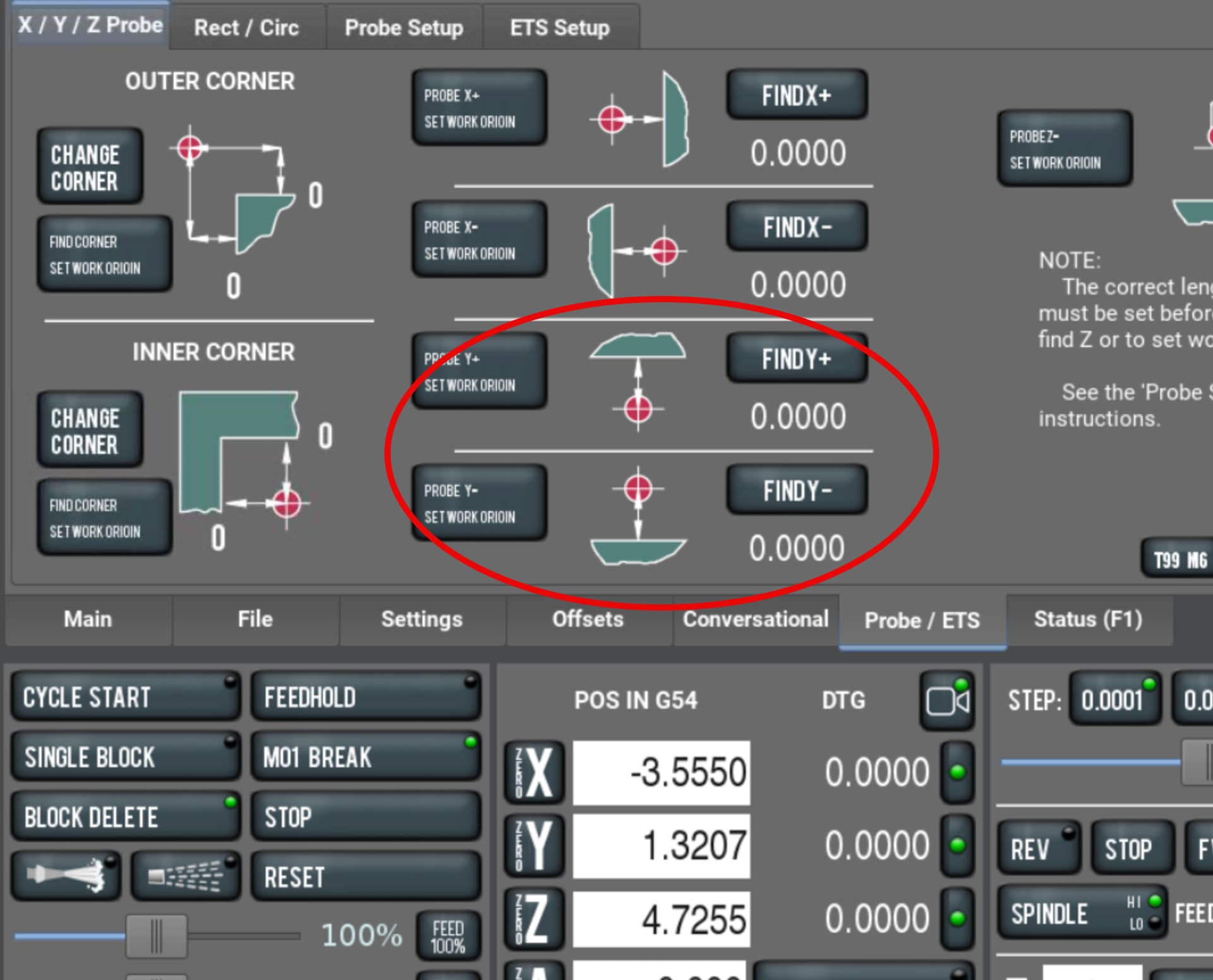 All the probing routines Im using for Ian’s procedure are all basic Path Pilot routines. The positions the probe tip is in, in the pictures, are from me using GOTO Z0 Y0 manually by entering into MDI after I have performed all the steps in Ians procedure.