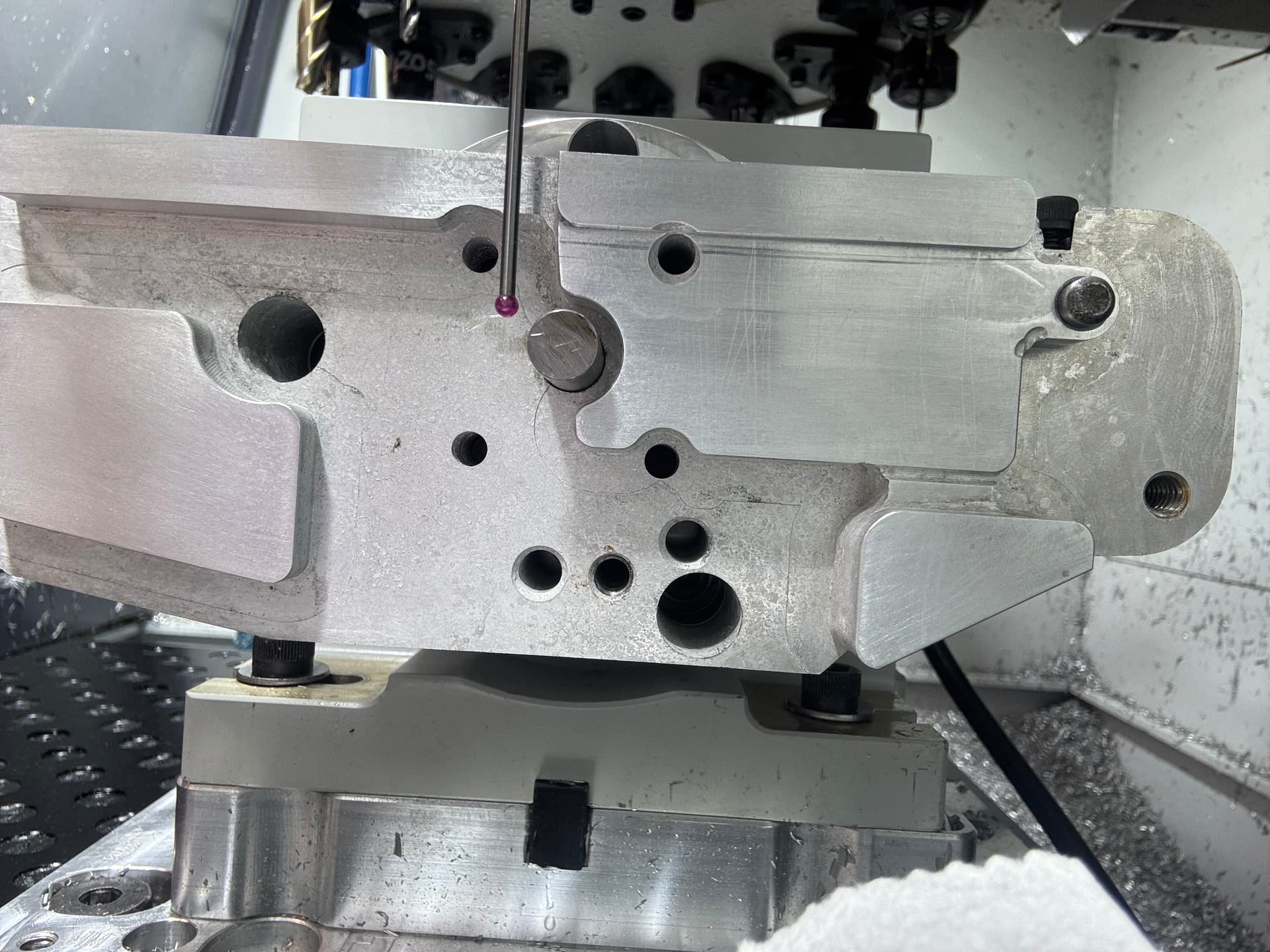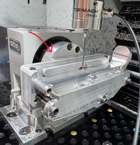Here’s a thought, Kind of a crazy one, yesterday I started thinking about using the outer diameter of the Micro Arcs mounting ring OR the GTM adapter plate shown here with arrow as my probing surface and running the Path Pilot (probe A find center) I checked the clearance in CAD, and it looks good. Quesion is, if the OD would be mounted absolutely concentric to the Micro Arc’s center. ??? I even reached out to Steve Strange of GTM Manufacturing to get his input on the OD probing, have not got a reply yet. IF there is clearance, I could do this with my fixture mounted and I would be good to go. I have my doubts the OD is a good option to probe. I guess running an indicator on the OD would tell the story right?, I did not think of that last night. WHAT do you guys think of this method? It would be a simple solution for future milling of this part for sure!