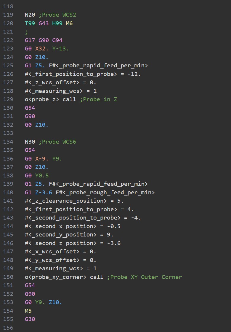 Finally, the macro is using the #<_probe_rapid_feed_per_min> and #<_probe_rough_feed_per_min> which are calculating incorrectly if your machine is set to use g21 millimeters. For example, my machine is set to use 635mm/min for rough feed, which again works perfectly for the built in routines. But this number gets output as 25mm/min and the probe moves extremely slow when using the macro. (635mm to inch = 25)