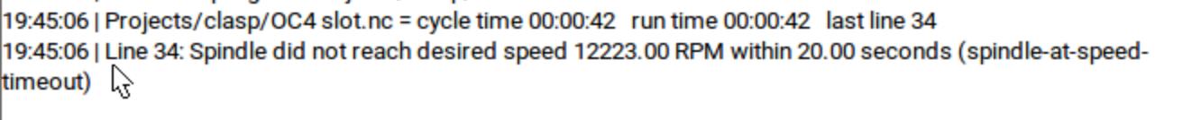 It then sits there for 20 seconds — and times out and shuts down with a “spindle at speed timeout”