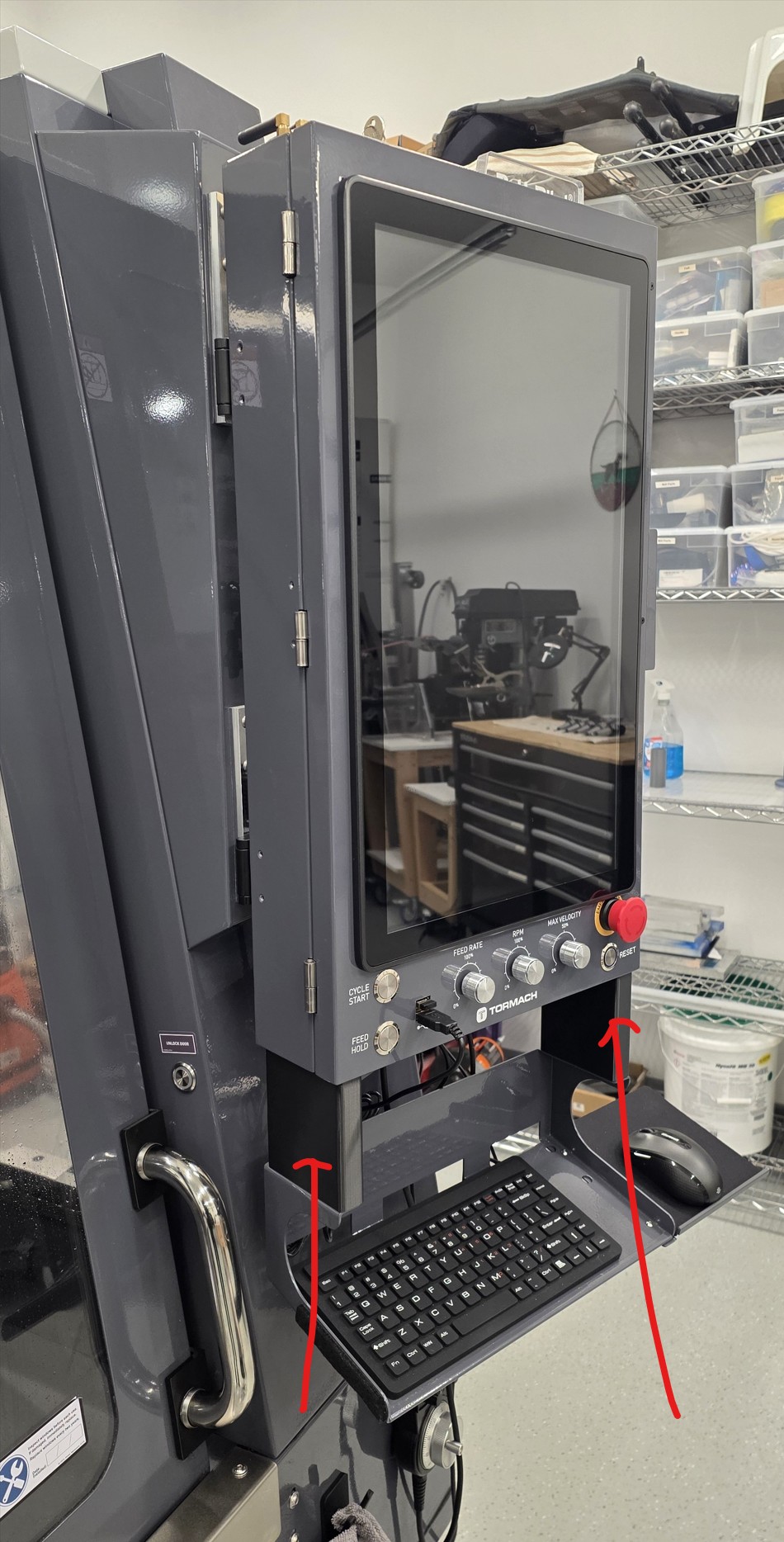 A . Monitor and Keyboard height not adjustable. I am 5”8 and found the keyboard and monitor way to high. I was a bit surprised that there is no way to adjust it. The monitor is mounted to the mill with two hinges. You could drill and tap a new set of holes a maximum of 3.75” lower, but I choose to use my new mill to machine a few brackets to offset the height of the hinges. You cannot go lower than 3.75” or the DB25 connector on the rear of the monitor will interfere with the mill.