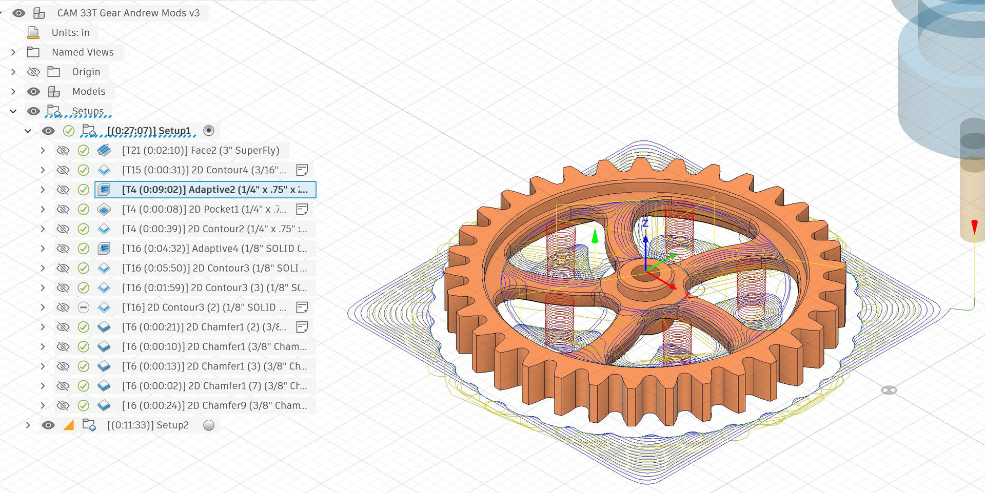 I did however run into a feeds and speeds challenge. The root filet radius for these gears is .07, only slightly larger than the 1/8” end mill I’m using to machine the tooth profile. A senior machinist on the Fusion CAM forum helped me a bit with the F&S for this run. In short, the approach was to use a 1/4” YG1 aluminum specific end mill for with 3D adaptive and a few 2D contour tool paths to rough out the part and finish the interior (see below), followed by a 2D Adaptive and a couple contour tool path with a 1/8-inch aluminum specific end mill.